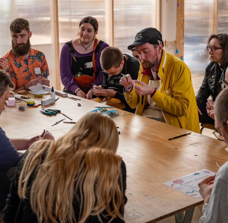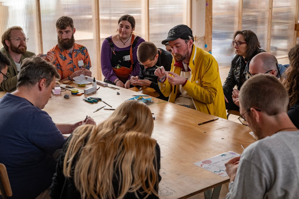 The workshop begins with a collaborative "exquisite corpse"-style game, followed by time to develop a personal piece. Participants learn sculptural construction, material reuse, and how to let go of perfection in favour of discovery.
