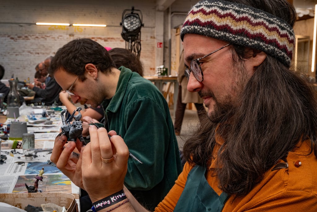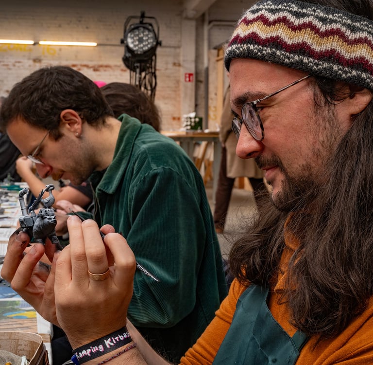 We begin the session with a collaborative exercise where everyone paints on a shared test model, trying out techniques like drybrushing, washes, layering and highlighting. This low-pressure warm-up encourages experimentation and helps participants understand how paint behaves at a small scale. After the warm-up, each person chooses a miniature to paint themselves: either one they created in a previous kitbashing workshop or one we provide.
