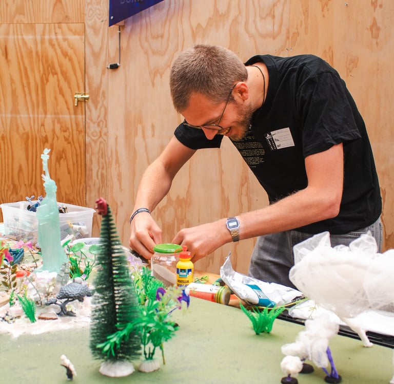 Our work invites participants to step into that space. To build a creature out of broken toys. To craft a tiny tower and ask: who lives here? To laugh together over strange inventions. To create, share, and imagine.